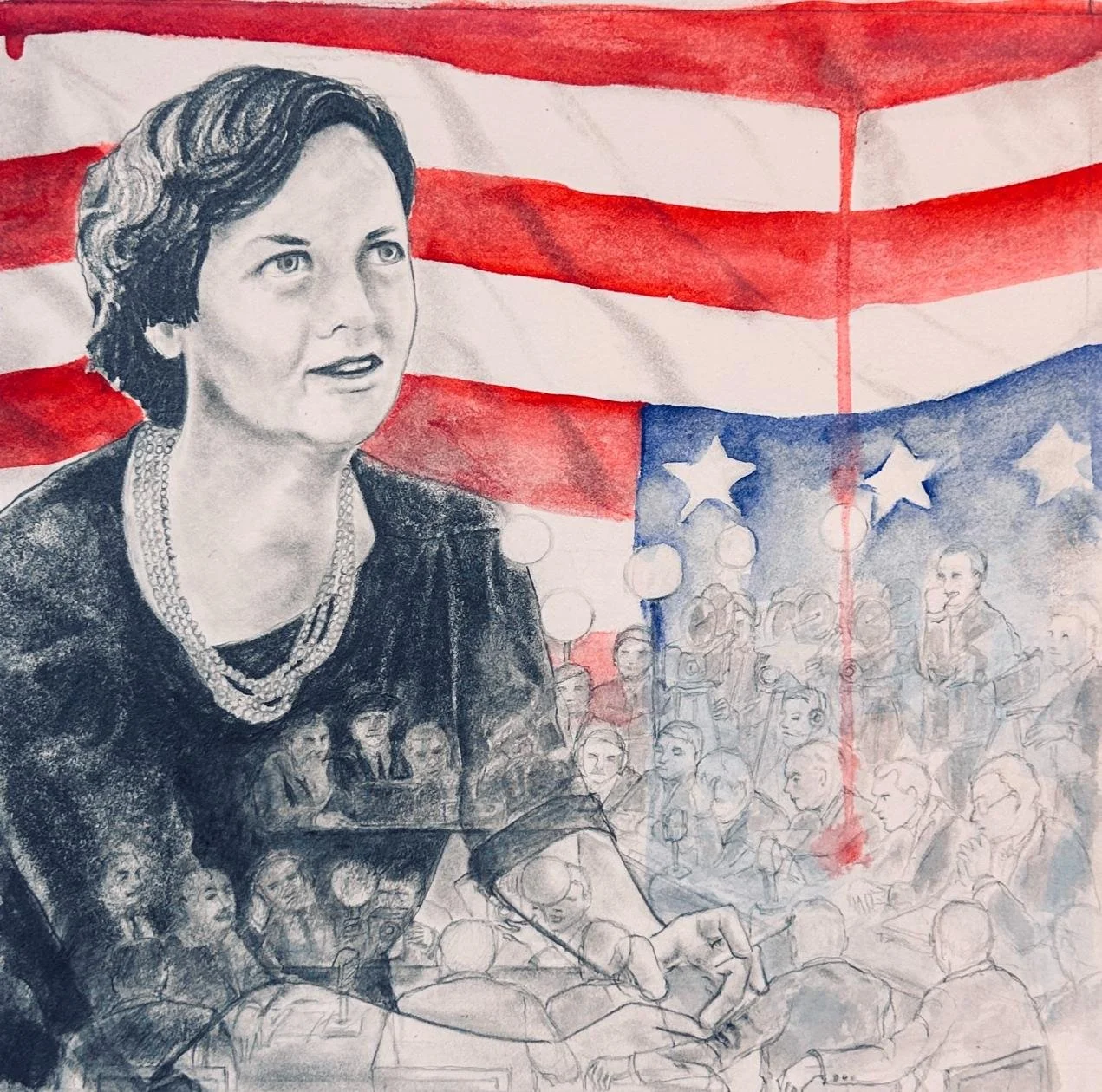 This drawing of Ms. Mitford shows her against a background of the House Un–American Committee hearings, a young Richard Nixon is seated to the right.